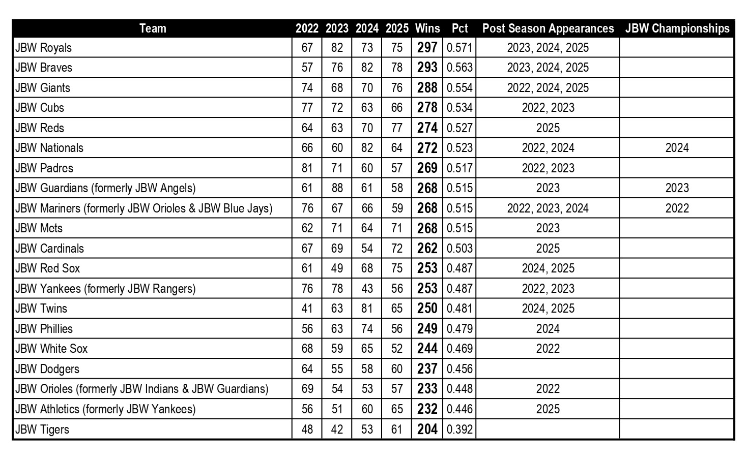 JBW Cardinals took two out of five games @ JBW Padres, and forced a one-game playoff vs JBW Mets (date & time TBD), Sunday November 2