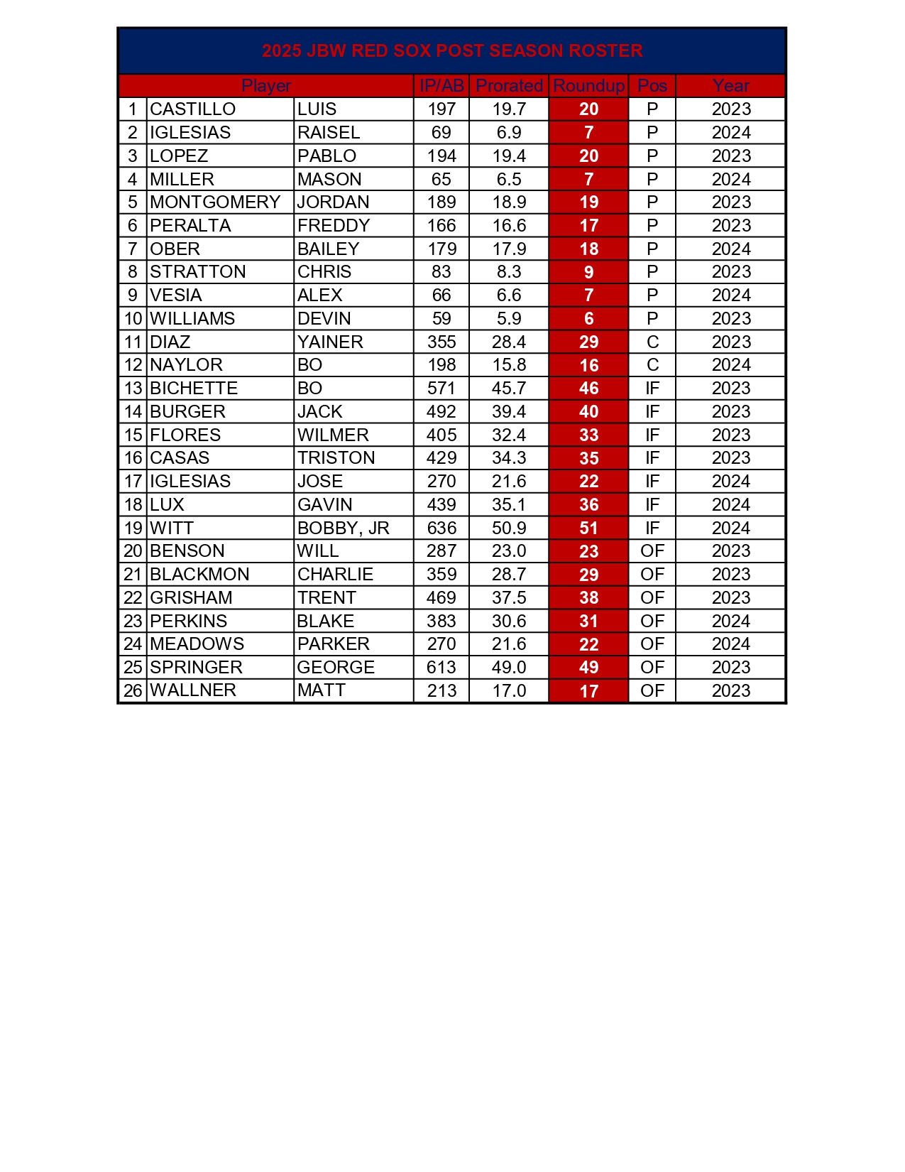 2025 JBW Red Sox Post Season Roster